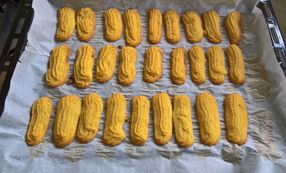 Úgy készült, mint a hagyományos piskóta. A tojássárgákat kikeverem az eritrittel, majd bele a sütőporral elkevert liszt és végül de ezt már kézzel és nem géppel az előzőleg kemény habbá vert fehérje. Habzsákba töltjük, majd kinyomjuk, a sütőpapírral bélelt tepsibe. 180 fokon alsó felső sütésen 10-15 percig sütöttem. A sütési idő sütőtől függően eltérő lehet, de a színén látszik mikor már jó.