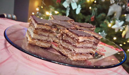 4 db egyforma részre osztottam a tésztát. 32x22cm tepsi méretre nyújtottam. Egy tepsire sütőpapírt tettem majd vékony téglalapokra nyújtottam a 4 tésztagombócot. Az elsőt a tepsire tettem, majd a lapot megkentem baracklekvárral és megszórtam darát dióval. Minden rétegnél ezt ismételtem, csak a középső rétegbe ribizli lekvár került.